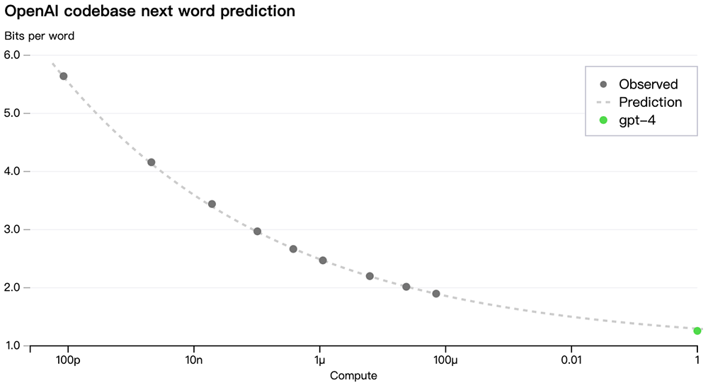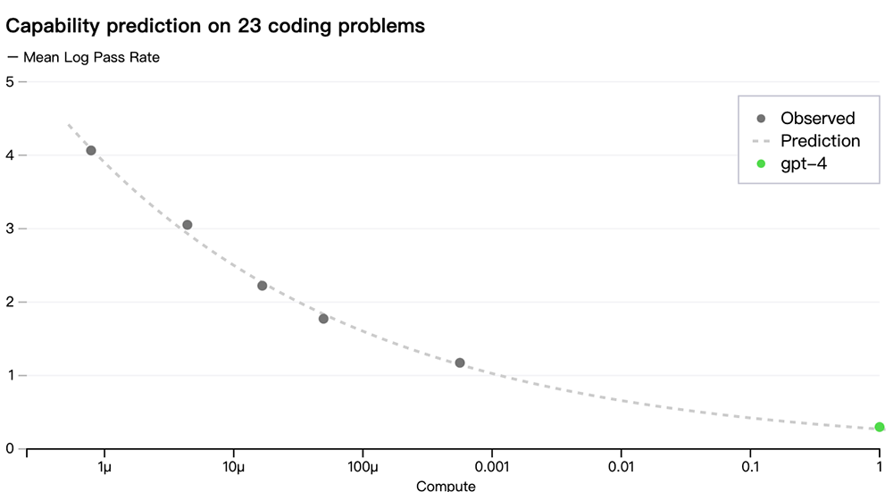 为了验证这种可扩展性,OpenAI通过从使用相同方法训练但计算量减少到原来的1/10000的模型进行推断,准确预测了GPT-4在其内部代码库(不属于训练集)上的最终损失: