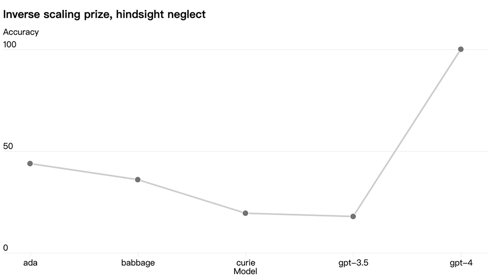 有些能力仍难以预测。例如Inverse Scaling Prize是一项竞赛,目的是寻找随着模型计算量的增加而变得更糟的度量指标,而hindsight neglect是获胜者之一。就像最近的另一个结果一样,GPT-4 扭转了趋势: