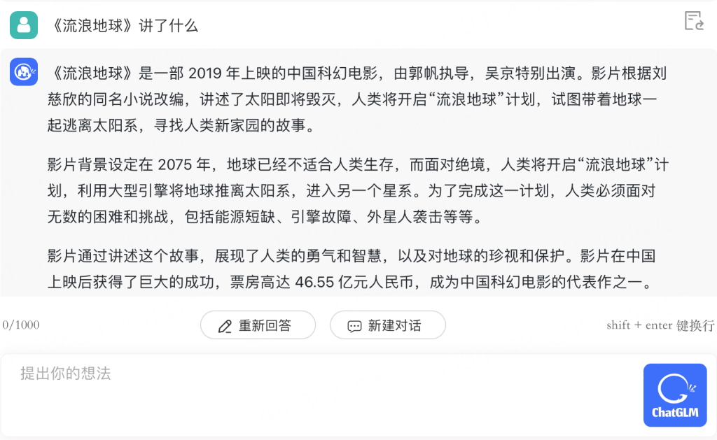 ChatGLM-6B使用了和ChatGLM相同的技术,针对中文问答和对话进行了优化,具备较好的对话与问答能力。以下是其对话效果的一些示例: