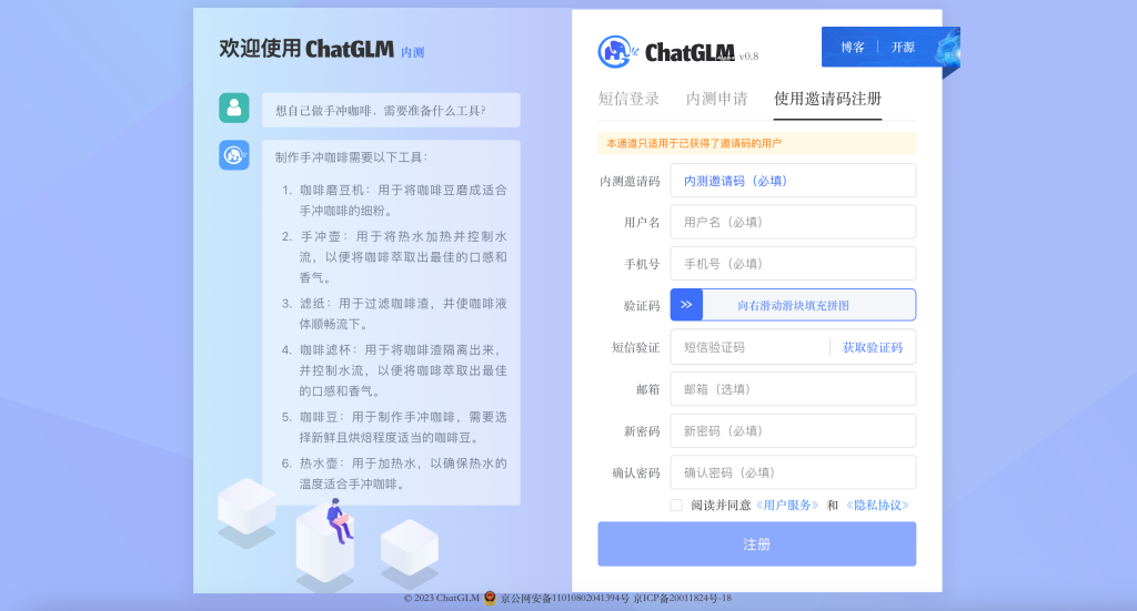 由清华大学计算机系技术成果转化而来的公司智谱AI,现已开启ChatGLM线上模型的内测。用户需要使用邀请码进行注册,也可以填写基本信息申请内测。