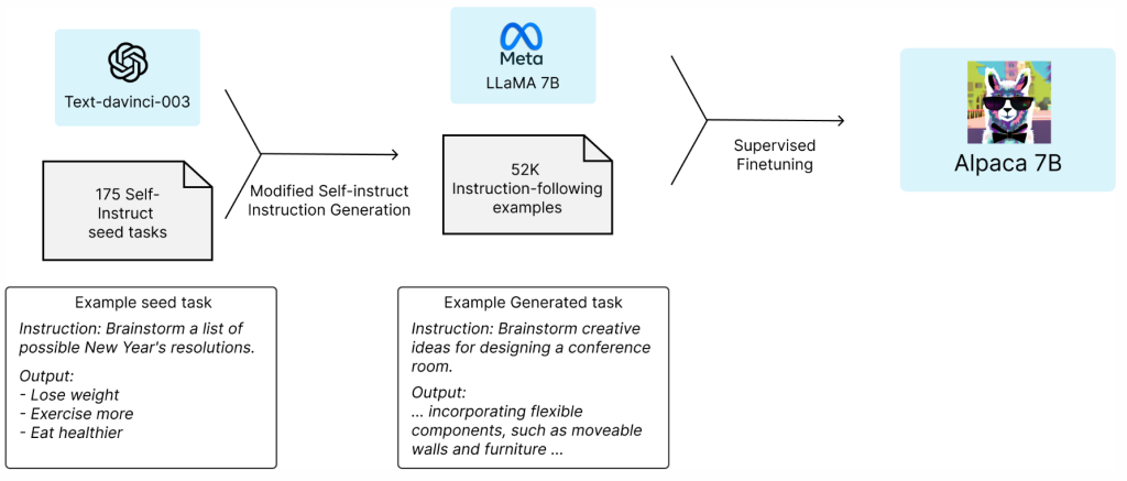 具体而言,Alpaca模型使用来自LLaMA 7B模型的监督学习进行了微调,基于来自OpenAI text-davinci-003的52K指令跟随示例。