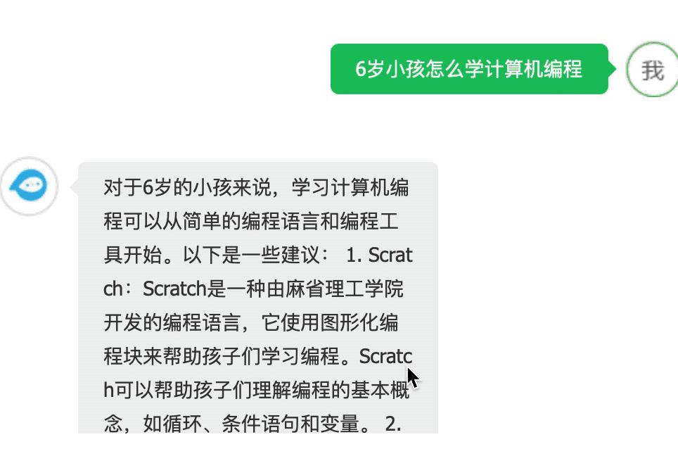 辅助决策方面,海豚可以自动为用户提供相关的数据和分析结果,并为用户提供决策建议和优化方案;还可以为用户提供各种决策模型和工具。下图是海豚AI助手针对“6岁小孩怎么学习计算机编程”问题给出的回答。
