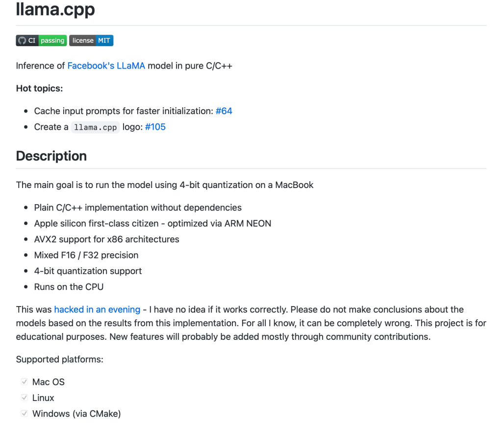 Georgi Gerganov近日公布了一个没有专用GPU也能跑Meta大模型LLaMA的项目llama.cpp。