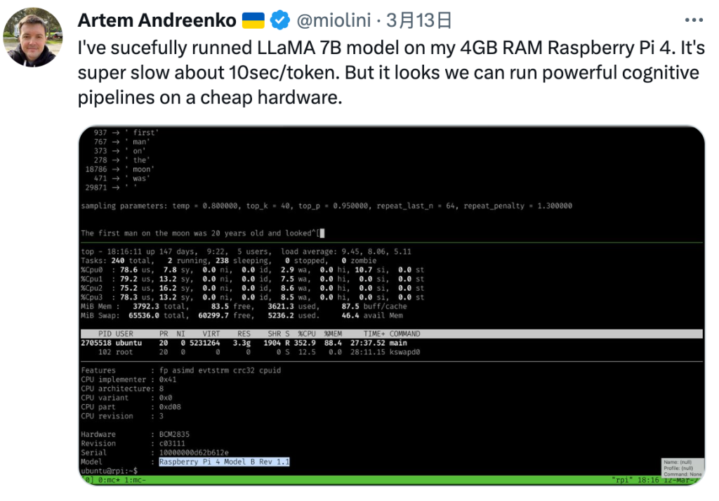 研发人员Artem Andreenko说,他已在4GB RAM Raspberry Pi 4上成功运行LLaMA 7B 模型。尽管速度很慢,大约10秒/token,但这展现了在便宜的硬件上运行强大认知pipelines的可能。
