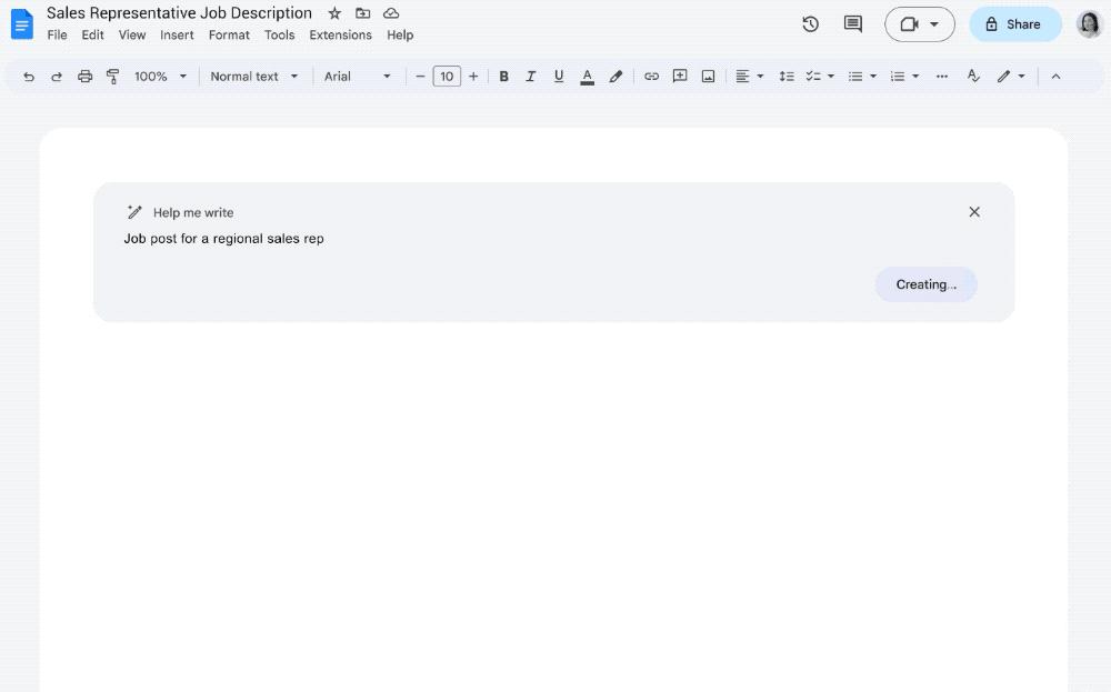 本周二,谷歌宣布开放大型语言模型PaLM API,帮助企业“从简单的自然语言提示中生成文本、图像、代码、视频、音频等”。下图是生成式AI在谷歌文档中帮助撰写职位描述的示例。
