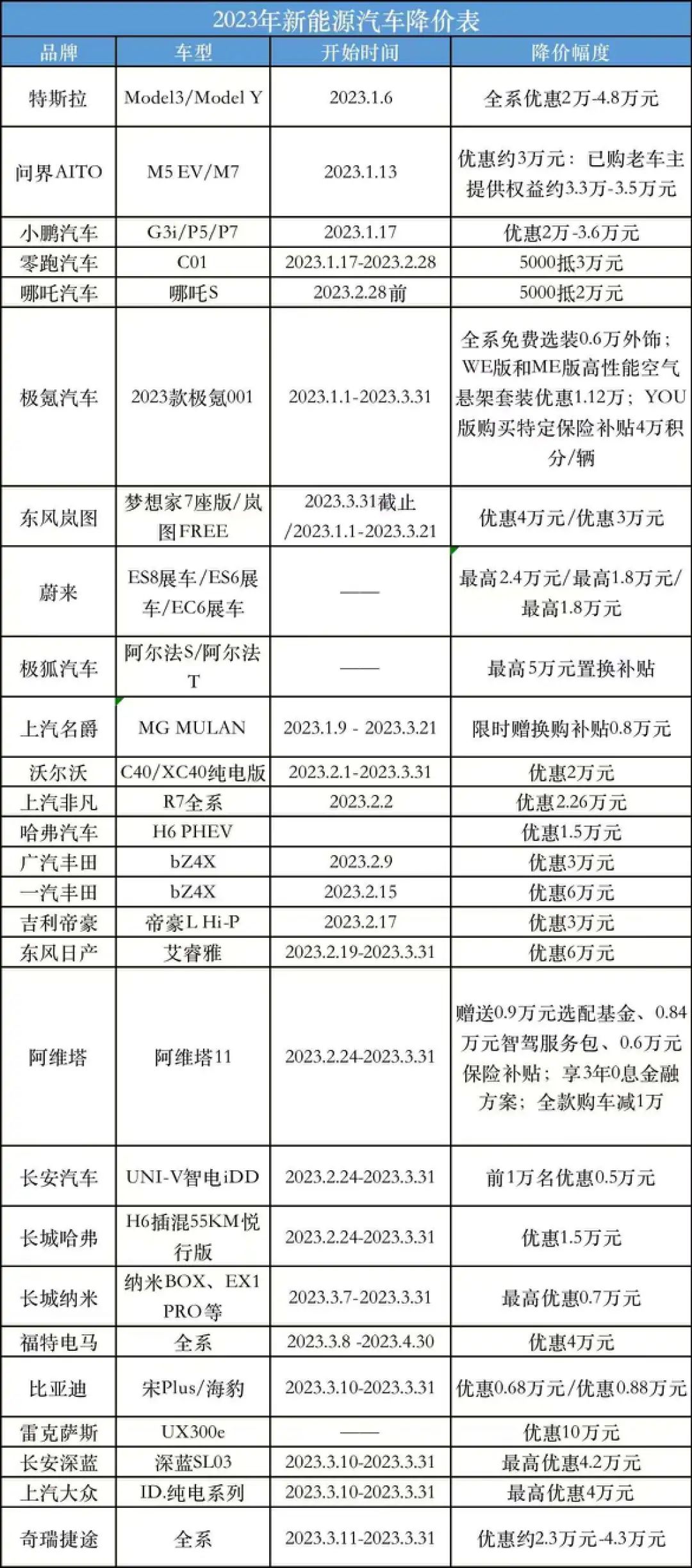 此外,随着2月份蔚来886车型升级换代,老款车型迎来清库存,多种优惠叠加后综合降价可达10万元。进入3月,随着小鹏P7i的上市,老款小鹏P7将享受额外的1万元现金优惠和7000元保险补贴。零跑2023款新车C01降价3.5万-5.8万元,C11降价1.6万-6万元,T03的购车门槛也降至最低2.26万-5.99万元。