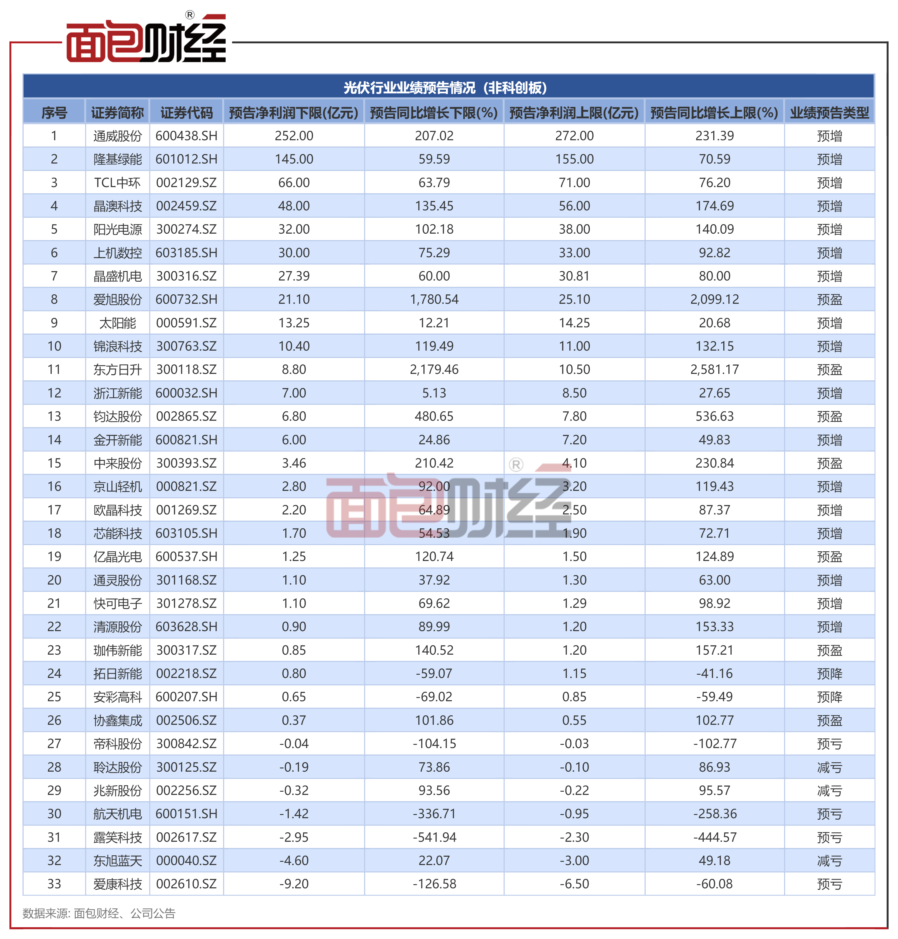 截至2023年3月14日,根据申万行业分类,A股光伏设备和光伏发电领域共计66家光伏公司,有51家发布了业绩预告、业绩快报或年报。其中44家公司公布2022年度业绩预告,20家公布2022年度业绩快报,1家发布2022年年报。