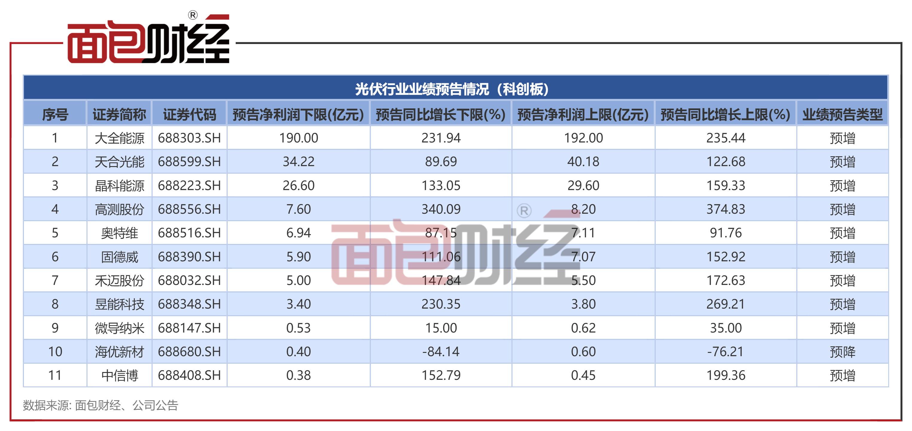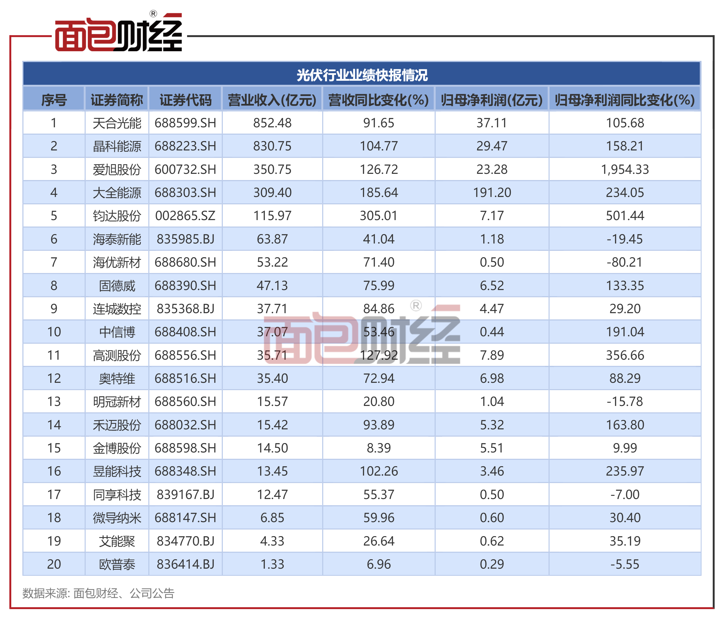 已公布业绩快报的20家光伏上市公司营收均超1亿元,其中2家营收超800亿元,分别是天合光能和晶科能源;20家光伏上市公司均实现净利润同比增长,其中6家营收同比增长超一倍,钧达股份营收同比增长最快达305.01%。