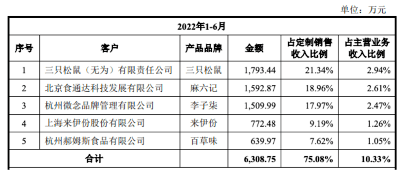截至2022年1-6月,三只松鼠、麻六记、李子柒、来伊份和百草味是其排名前五的代工品牌。三只松鼠作为阿宽食品的最大代工客户,销售金额为1793.44万元。