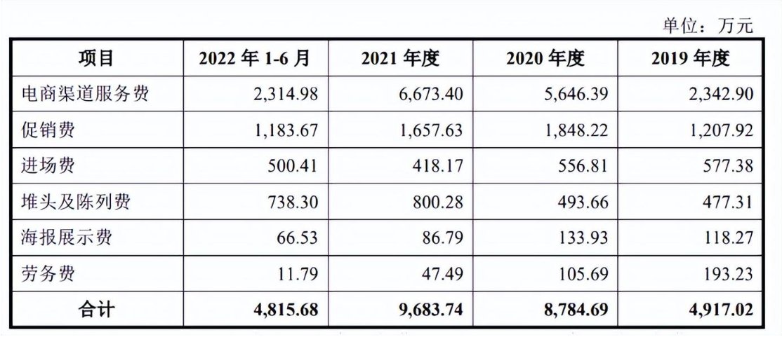 招股书显示,2019-2022上半年,阿宽食品的电商渠道服务费分别为2342.90万、5646.39万、6673.40万和2314.98万。也就是说,在2020年2.3亿的电商自营收入中,有近25%需要作为推广费用支付给电商平台和主播。