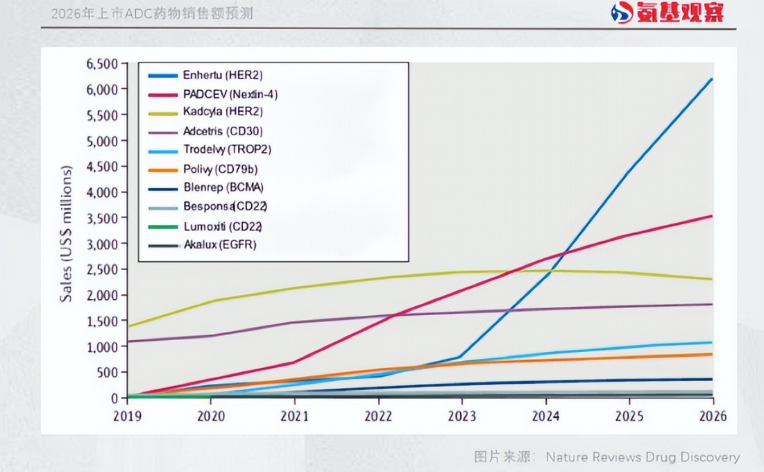 2021年,《Nature Reviews Drug Discovery》发布的一篇文章预测,到2026年全球已上市ADC药物市场规模将超过164亿美元,折合人民币近1100亿元。