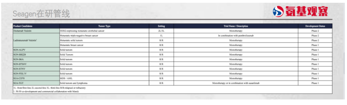 此外,Seagen于2021年8月,以2亿美元预付款+24亿美元里程碑金额,引进了荣昌生物的HER2 ADC新药维迪西妥单抗,进一步扩充了自身管线实力。