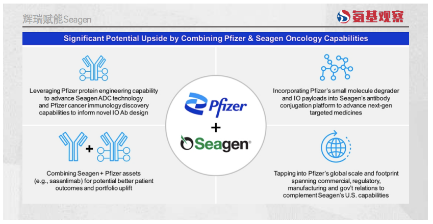 而辉瑞作为宇宙大药厂,其在研发、临床、商业化方面都具有显著优势,这也将赋能Seagen。如下图所示,在辉瑞的预期中,双方将会在多个环节展开合作。比如,辉瑞表示,Seagen的能力圈只限于美国,而自己拥有全球的布局,涵盖商业化,政府关系、制造等诸多环节,无疑能放大其管线价值。