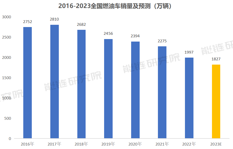 最大的影响可能是助推了燃油车保有量达峰点的提前到来。按照能链研究院的模型预测,2017年,中国燃油车销量达到了2810万辆,也是历史上最高的峰值,而后几年持续下滑,一直降至2022年的1997万辆。反而,国内燃油车的报废量持续攀升,从2020年的500多万辆增至2022年的800多万辆,燃油车年度销量净值与报废量间的差距不断缩小。当报废量超过销量净值时,燃油车的达峰点就会出现。