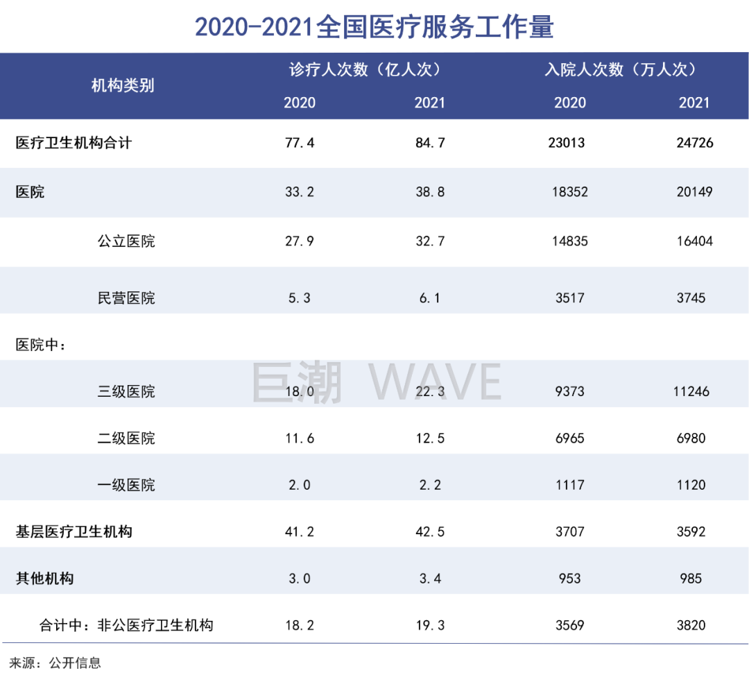 2021年,我国公立医院诊疗人次为32.7亿人次,是民营医院的5.4倍;