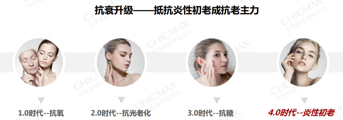 “抗老”课题在历经抗氧、抗光老化、抗糖后终于迎来了4.0时代——抗炎性初老,有效抵御由于慢性炎症导致的皮肤衰老。衰老进程中,机体长期处于低度慢性促炎性反应进行性升高的状态,整体皮肤状态逐渐形成破坏>修复的现象,皮肤易出现敏感痤疮、色沉、黄褐斑等问题,皮肤衰老由此放大,进而加剧玻尿酸流失老化、屏障受损老化型、色素沉淀老化型、胶原流失老化型等四大肌肤初老症状。