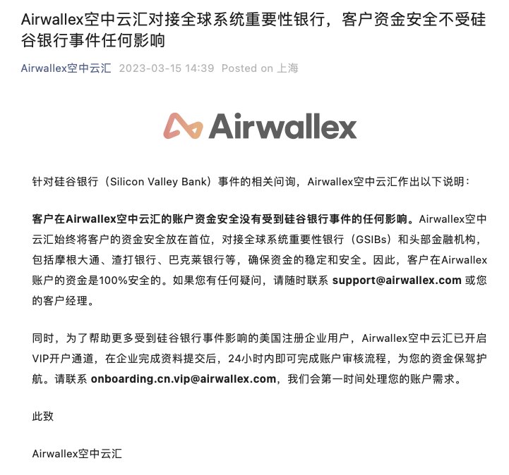3月15日,跨境支付公司空中云汇( Airwallex )发布声明称,客户在空中云汇的账户资金安全没有受到硅谷银行事件的任何影响。客户在空中云汇账户的资金是100%安全的。
