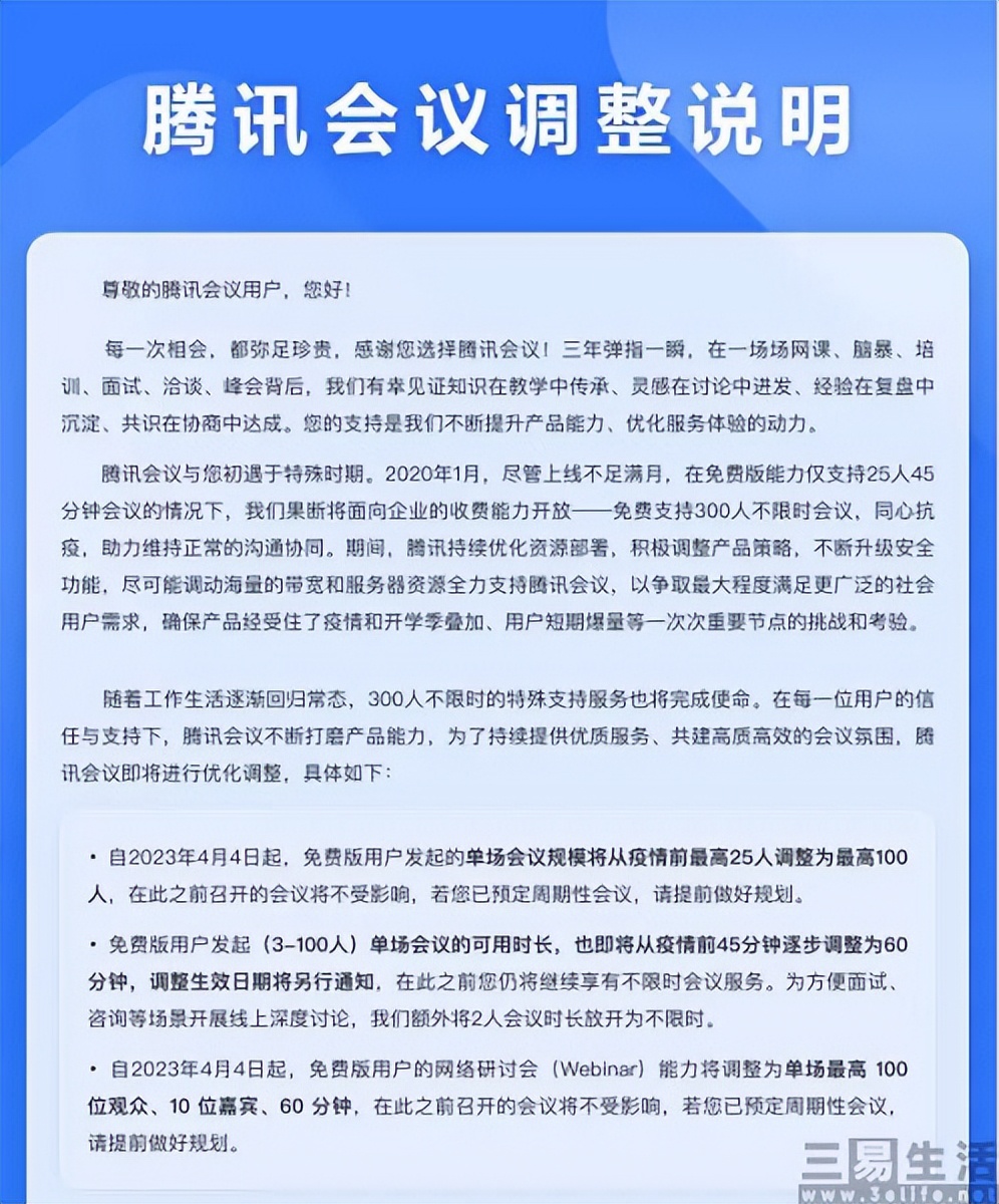 根据腾讯会议方面的解释,“2020年1月,尽管上线不足满月,在免费版能力仅支持25人45分钟会议的情况下,我们果断将面向企业的收费能力开放一一免费支持300人不限时会议,同心抗疫,助力维持正常的沟通协同……随着工作生活逐渐回归常态,300人不限时的特殊支持服务也将完成使命。”