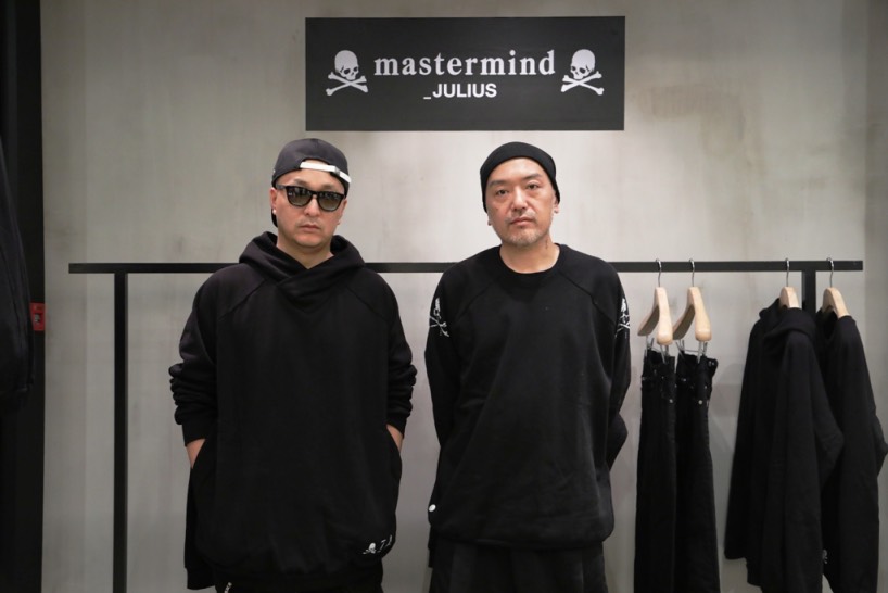 在和他们对聊前,_JULIUS的创始人堀川达郎从身后的货架上取下一件mastermind JAPAN x _JULIUS 系列中的黑色套头衫,穿在自己身上——“他想试一试。”身边的工作人员说。在那件套头衫上的背后,水钻制成的mastermind JAPAN标志性黑色骷髅头加入了_JULIUS的logo,而数字“7”则出现在衣服的下摆和袖子——这是_JULIUS的另外一个标记,同时也以刺青的形式印刻在堀川达郎的脖子上。