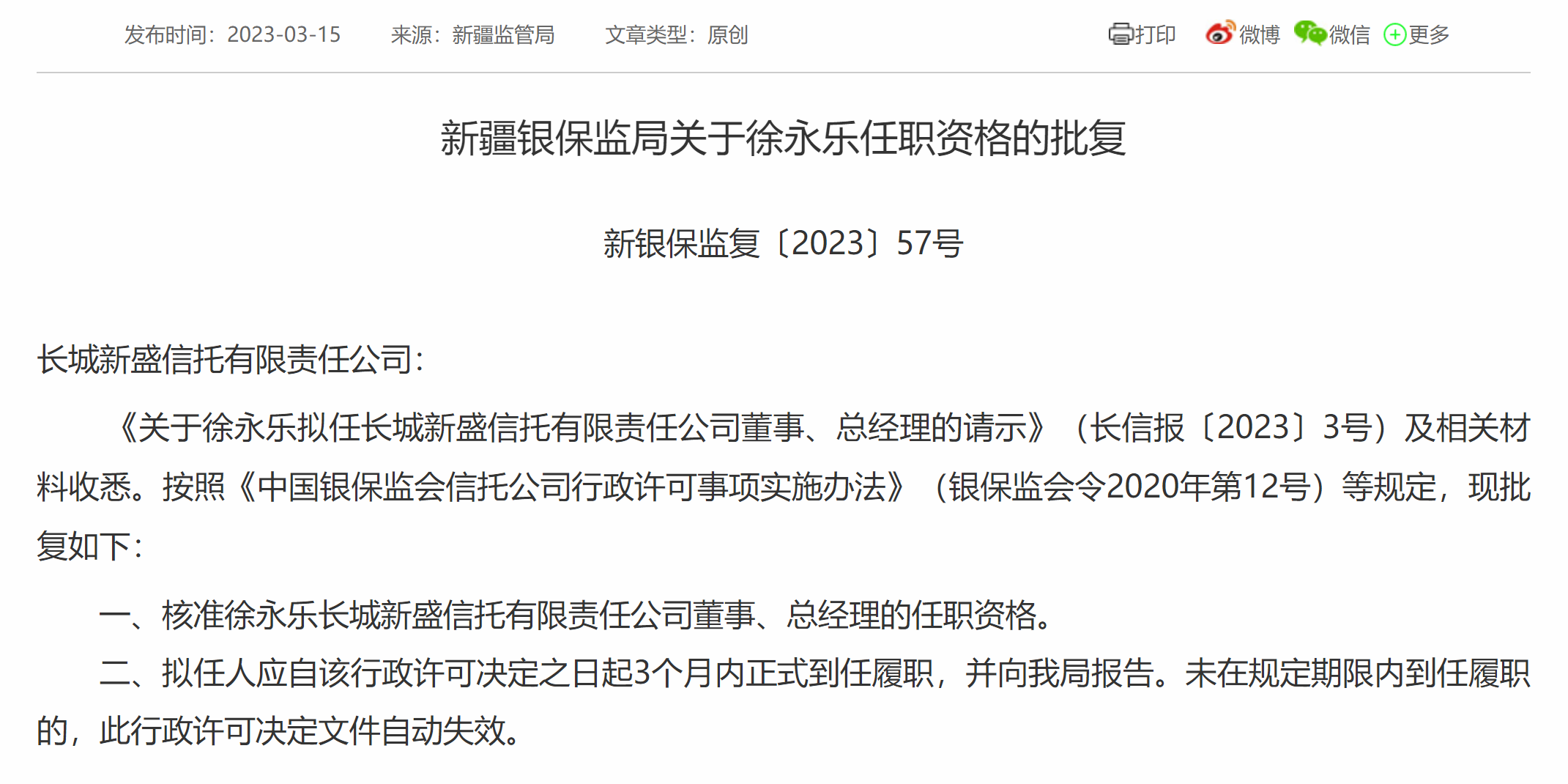 3月15日,新疆银保监局发布公告,核准徐永乐长城新盛信托有限责任公司(以下简称“长城新盛信托”)董事、总经理的任职资格。