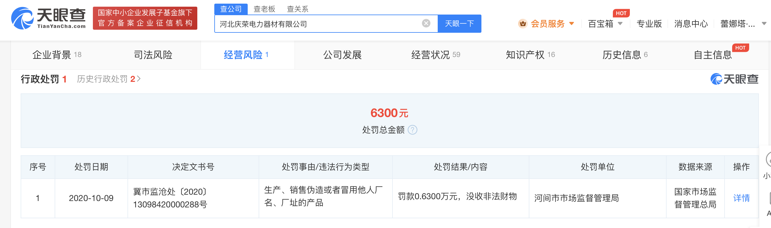 天眼查显示,2020年10月,庆荣公司曾因生产、销售伪造或者冒用他人厂名、厂址的产品,被河间市市场监督管理局行政处罚6300元,并没收非法财物。