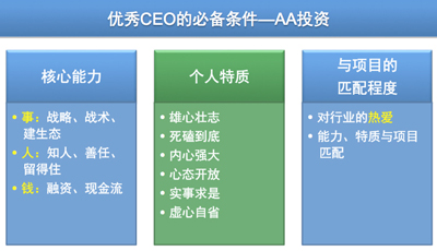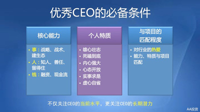 看人是AA投资的核心竞争力之一。我们最初曾经把优秀CEO的必备素质做了一个复杂的思维导图,里面包含上百项内容,不过可操作性差,最后为了方便使用,把它精简成3大类11项。这套系统归纳出来之后,我们拿最近一年看过和投资过的项目中进行验证,发现非常管用。