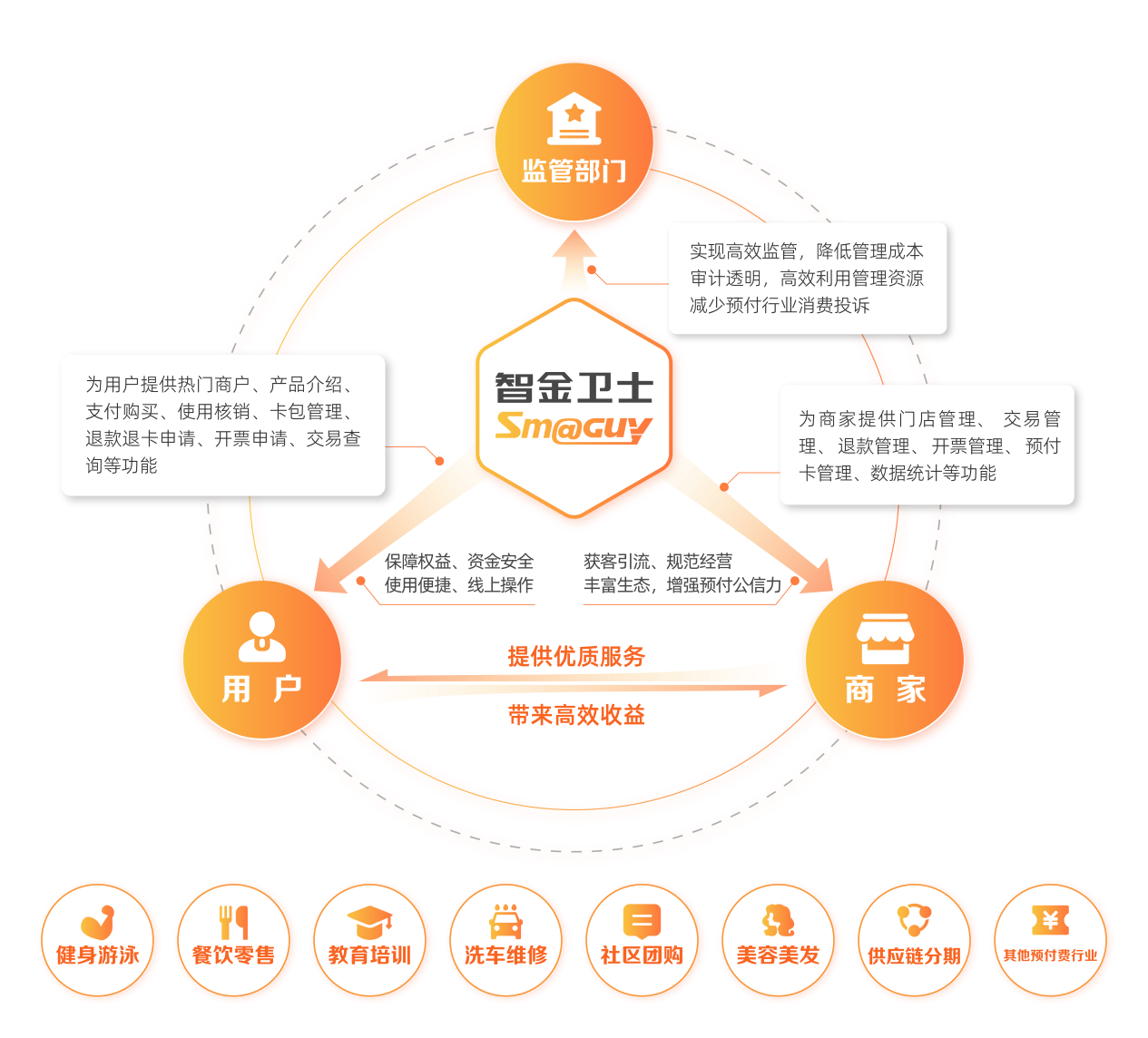预付费行业一直是备受关注的领域。然而,由于缺乏有效的监管机制和监管工具,消费者在购买预付产品时,往往存在着资金安全隐患。为了规范预付费行业,避免资金流失和消费者权益受损,各地政府和监管机构一直在努力推行预付资金监管制度,近期国务院办公厅印发了《关于深入推进跨部门综合监管的指导意见》,“意见”中提出要强化“互联网+监管”,加强信息技术运用,进一步加强跨部门综合监管。而智金卫士平台的上线,提供了数字化监管手段,助力完善跨部门综合监管体制机制,推动市场高质量发展,维护公平有序的市场环境。智金卫士正是使用数字化手段提升监管水平的案例,消费者可以在智金卫士平台上购买预付产品,通过数字人民币智能合约技术保障其预付资金安全,将有效地解决预付费行业中消费者权益受损的难题,使预付费行业更加规范、更加透明、更加便捷。也可以帮助商家拓展数字人民币业务应用场景,丰富商家线上获客渠道,快速建立消费者信任。同时,结合数字人民币实时到账、0手续费等特性帮助商家降本提效。有利于商家与金融机构建立长期的信任关系,未来可享受金融机构提供优质、低成本的金融服务。