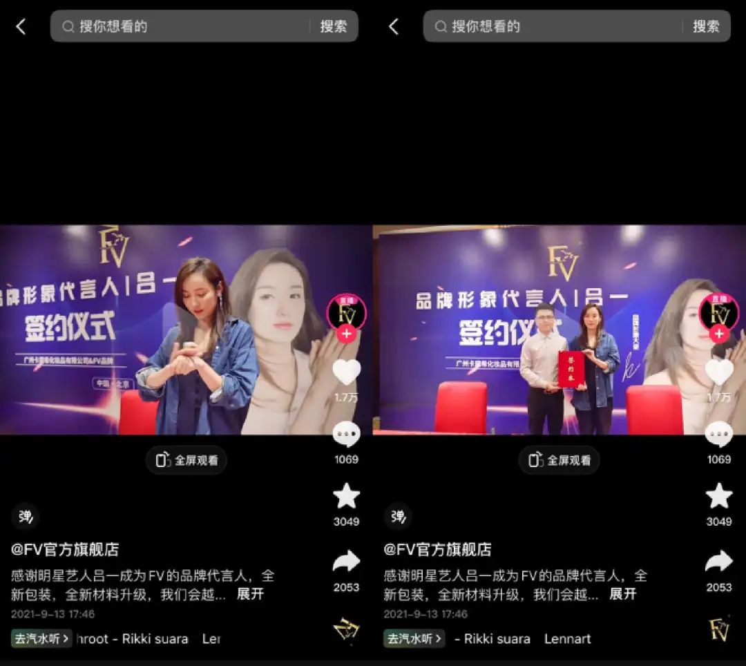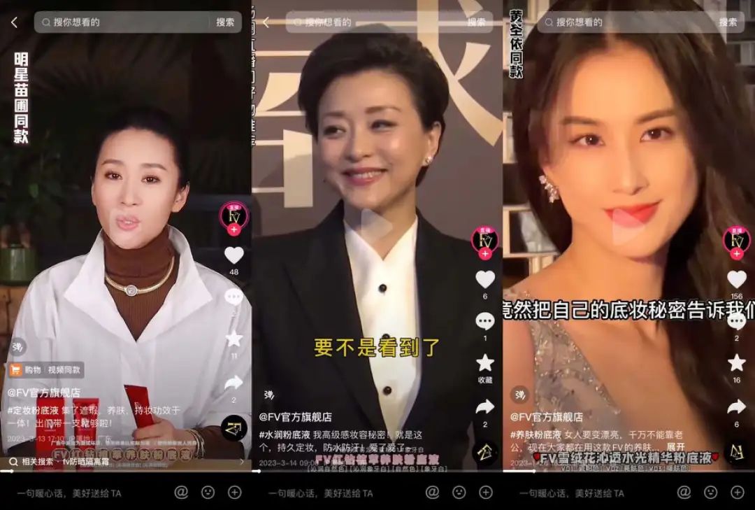 此后,FV又陆续邀请了明星闫妮、叶璇、万绮雯、金沙、包文婧以及花样游泳世界冠军陈晓君等为其推广,也在洪欣、何洁、作家杨澜等直播间亮相,而这些视频片段也成为了FV在抖音上反复宣传的素材。