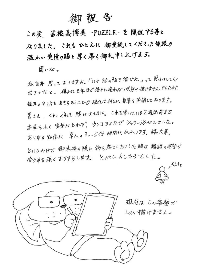 说到“休刊”,漫画爱好者脑内可能自动联想到被称作“老贼”的富坚义博,他曾因腰伤休刊却参加麻将比赛而常年被调侃,实际上,富坚的身体状况不容乐观。去年,他在为富坚义博展写寄语时,坦言自己因为腰痛,已经两年无法坐在椅子上正常作画,只能用半躺的姿势进行创作;而且写信的两周前,无法在上厕所后擦拭清洁,只能直接洗澡;许多日常动作,自己需要比常人多花费3到5倍的时间完成。