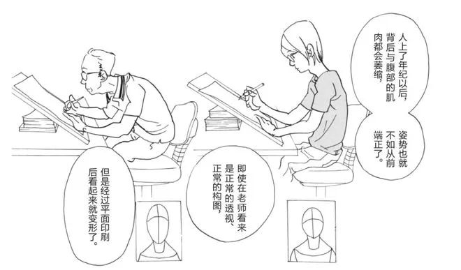 《重版出来!》中漫画家三藏山不知晓自己绘画比例失调,其实是年纪增长驼背导致,也能从侧面反映出常年保持创作状态对身体机能的影响。