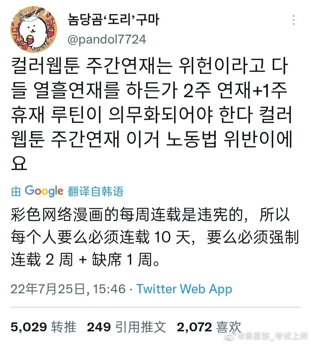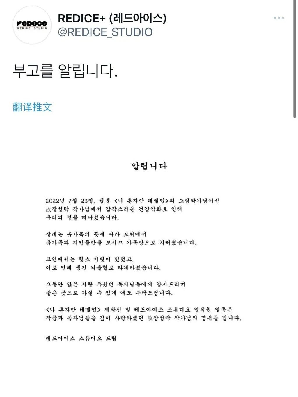 韩国也是如此。别看Piccoma全球疯狂吸金、成功打入日本市场的强劲势头,说起韩漫自然而然会浮现的还是“内卷”一词。例如平台已经于2022年1月完结的头部漫画《我独自升级》,最初为每周双更的连载模式,后改为周更。遗憾的是,漫画主笔DUBU于2022年7月23日因突发性脑出血去世,年仅37岁,当天距离IP宣布动画化才不到一个月。消息一出,韩漫高频更新、高精细度的彩图,对作者身体将造成怎样的冲击,又一次引发各国读者热议。
