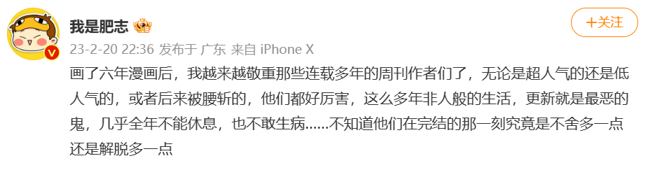 尽管中国漫画市场成熟度远远不及日韩,互联网漫画更新的要求却丝毫不减。打造了《如果历史是一群喵》《肥志百科》的肥志感叹:“画了六年漫画后,我越来越敬重那些连载多年的周刊作者们了,无论是超人气的还是低人气的,或者后来被腰斩的,他们都好厉害,这么多年非人般的生活,更新就是最恶的鬼,几乎全年不能休息,也不敢生病……不知道他们在完结的那一刻究竟是不舍多一点还是解脱多一点。”