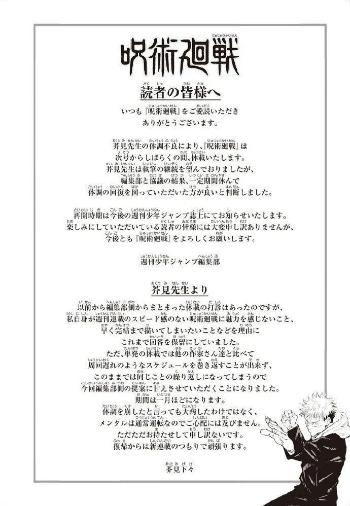 另一方面,编辑也会向作者提出自己的建议,像2021年的《咒术回战》因动画化人气高涨,原作后续却被吐槽“草稿风”一度登上日推趋势,作者芥见下下表示自己希望一直连载,在被编辑多次提醒后选择休刊一个月;