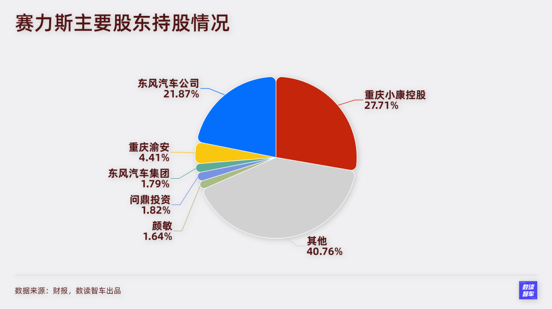 而股权关系上,相比于持续融资稀释股权,赛力斯的股权结构稳定,主要股东都是张家和东风集团关联企业。张家三兄弟100%控股的重庆小康控股持有赛力斯30.98%的股权,重庆渝安持股4.93%,张兴海夫人严敏持股1.93%,张家直接或间接持股合计37.84%。东风汽车公司和东风汽车集团合计持股27.75%。