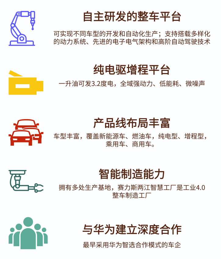 主要代表车型包括问界M5、M5 EV、M7、赛力斯SF5、风光MINI EV等。覆盖了新能源车、燃油车,纯电型、增程型,乘用车、商用车。