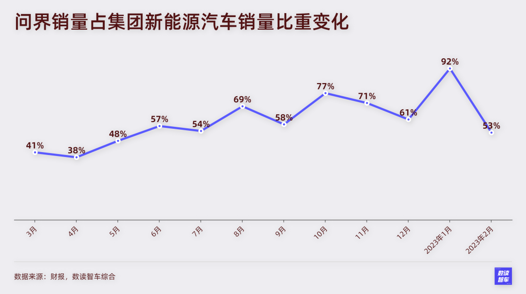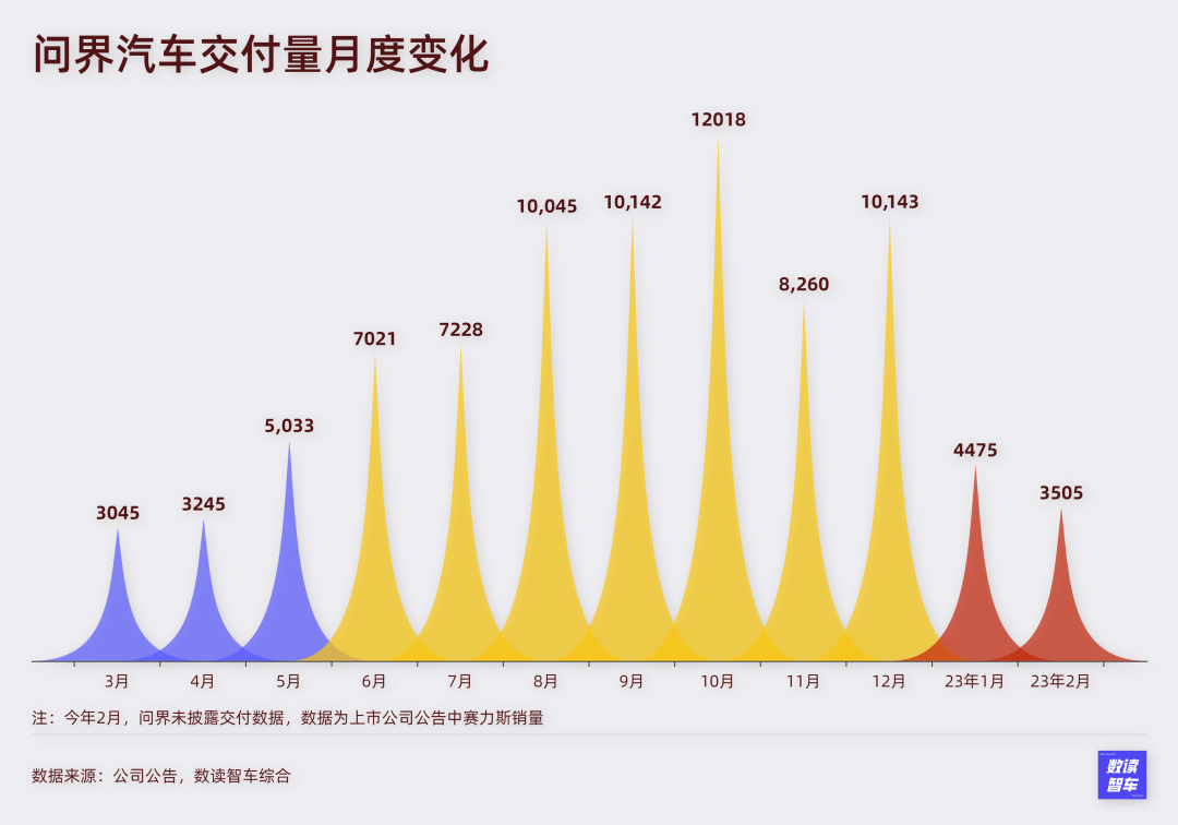 可进入2023年,形势却急转直下。1月,问界仅交付了4475辆,从去年4月开始,问界就未曾出现过这么惨淡的局面。到了2月,问界干脆没有公布交付量,按照赛力斯公布的产销数据估算,2月可能只有3500辆左右。
