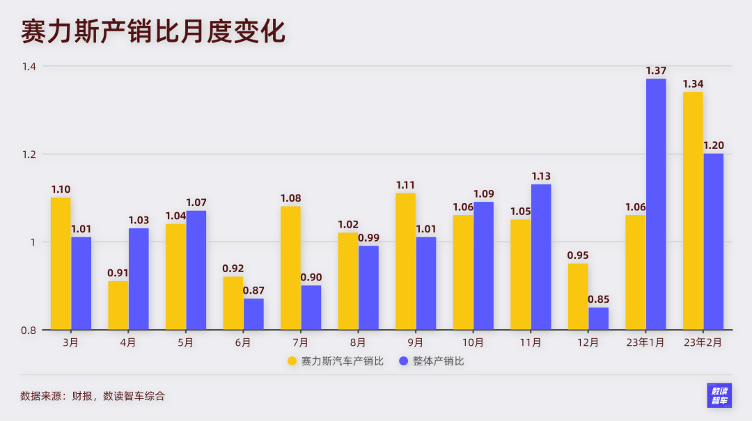 更麻烦的是,赛力斯整体的产销比在走高,二月,赛力斯的产销比高达1.34倍,生产的车比销售的车辆多出上千台,这会进一步带来库存压力。