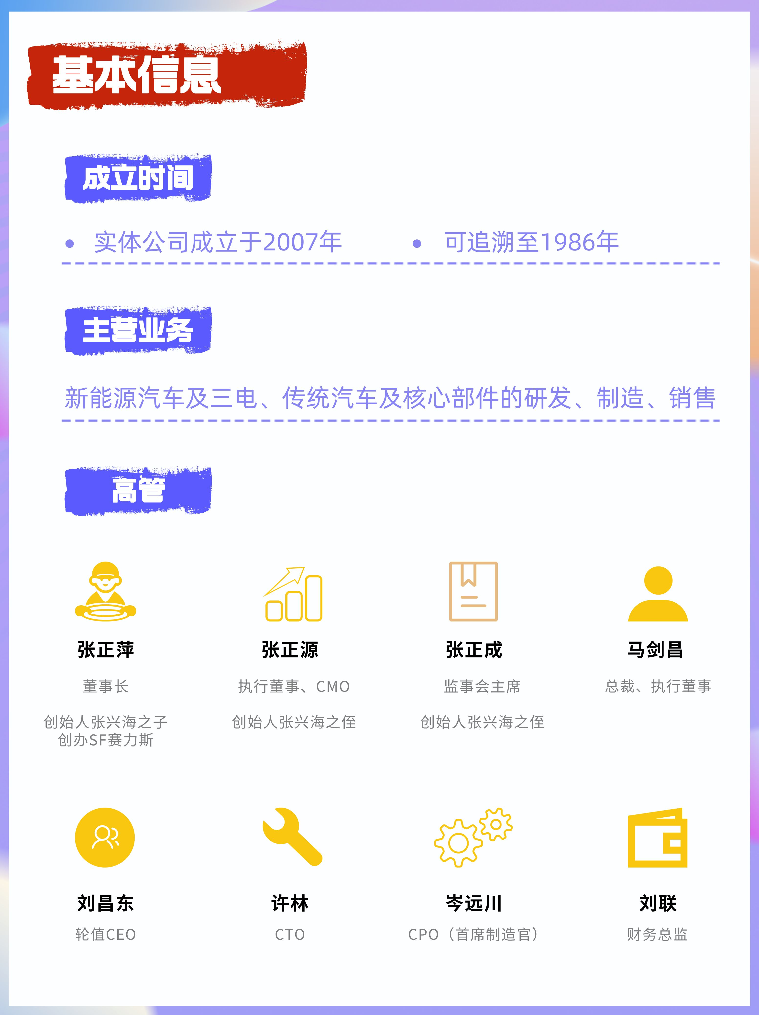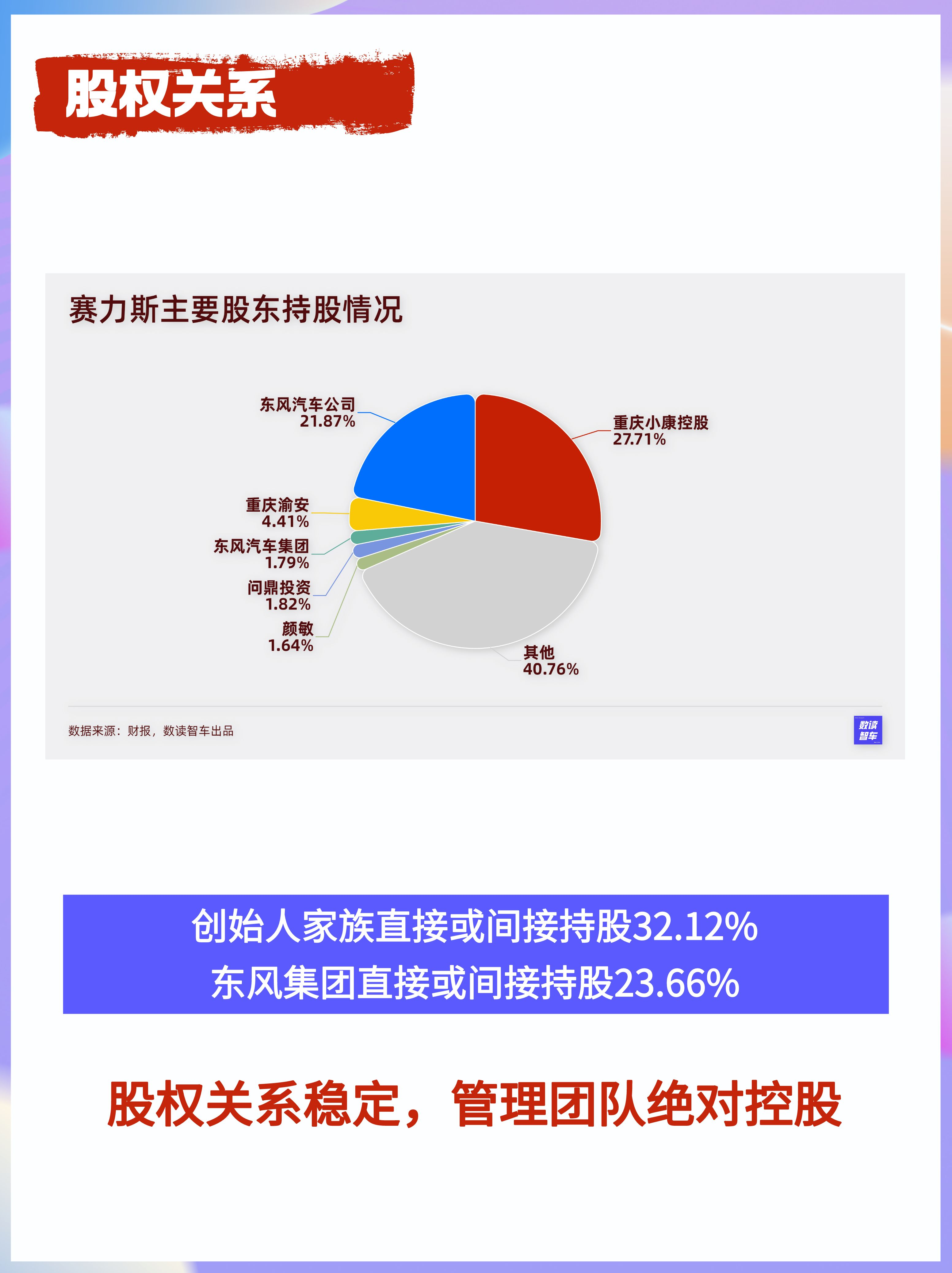 1、赛力斯开始于企业家张兴海个人创业,创始人家族掌管公司经营,股权稳定。