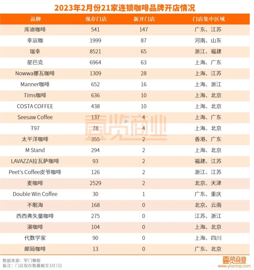 据壹览商业统计数据显示,2月份库迪开店147家,新开门店排名第一,而1月份开店最多的是瑞幸,2月瑞幸仅开店65家,仅为库迪2月开店的一半。咖啡行业从来不缺挑战者,而库迪直接将枪口对准了瑞幸。