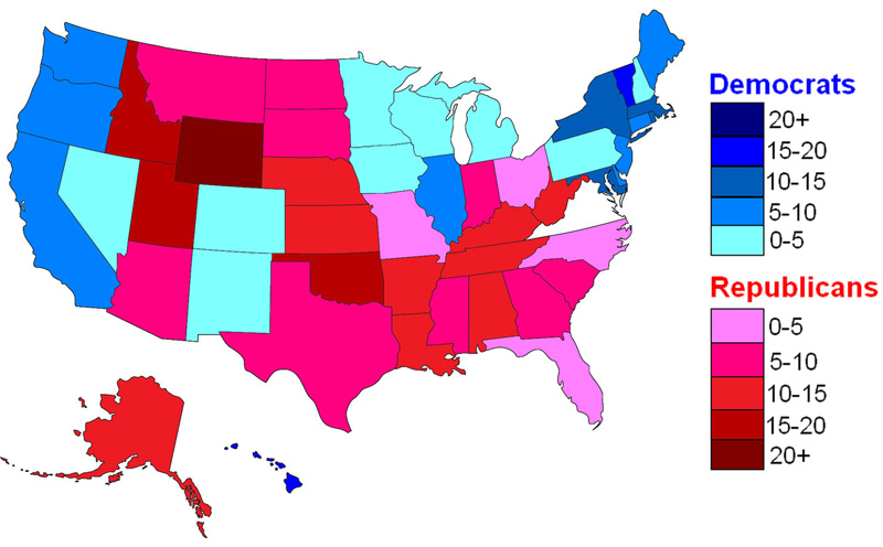 硅谷当然是属于典型的自由主义民主党派支持区,在PVI(党派政治偏向指数)地图上,除了东海岸的纽约以及宾州,就属西海岸的华盛顿州和加州是毋庸置疑的深蓝色了。