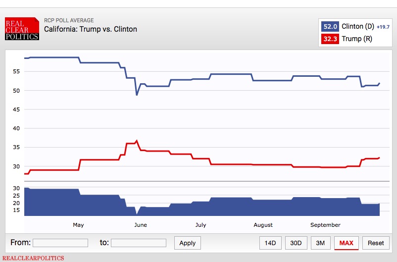 但即便是在深蓝色的加州,特朗普也仍然获得了一定的支持率。根据各家民调机构不同数据,特朗普普遍获得了30%以上的支持率,希拉里获得50%-60%左右的支持率。