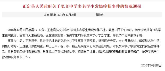 根据正定县政府通报,该县弘文中学小学部确有多名学生出现身体不适,截至18日下午16时,初步统计共有74名学生住院就诊,目前均无生命危险,正在留院观察。发病学生均为弘文中学小学部学生,涉及35个班中的27个班。