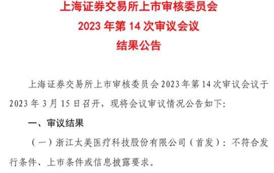 昨日,上海证券交易所上市委员会审核太美医疗首发事宜,最终审议结果为:不符合发行条件、上市条件或信息披露要求。