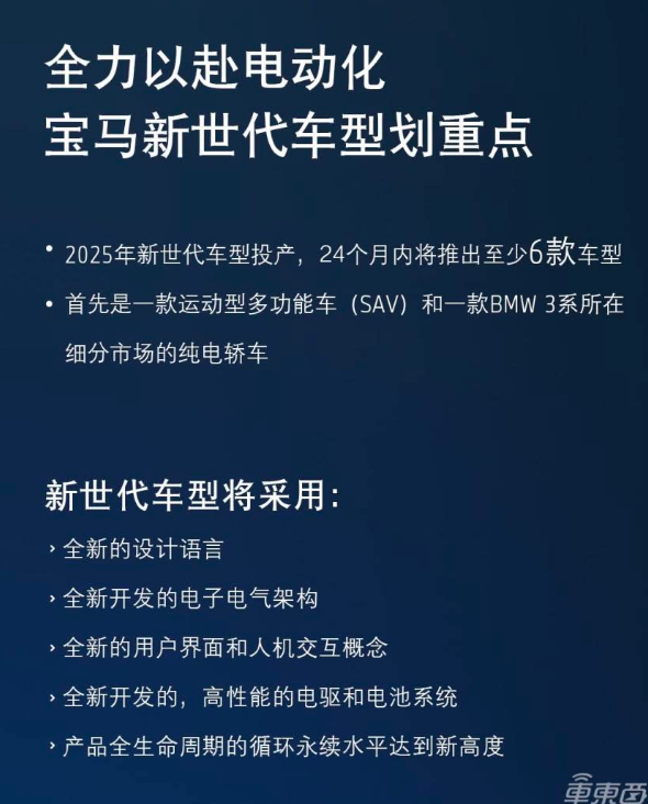 纯电动车型对营收贡献越来越大,未来宝马集团依旧会加大对纯电动车型的投入,宝马集团将从2025年下半年开始投产新世代车型。在随后的24个月内将有至少6款新世代车型实现量产,新世代车型的首发阵容将专注在宝马品牌的核心细分市场,其中包括一款运动型多功能车(SAV)和一款BMW 3系纯电轿车。