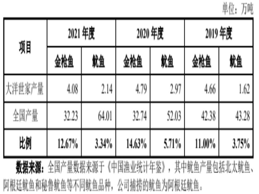 远洋渔业经过近七十年的历程,也取得了跨越式发展,我国的捕捞渔船的生产作业区域从最初的西非海域发展到 40 多个国家或地区管辖的海域和太平洋、印度洋、大西洋公海以及南极海域。根据《中国渔业统计年鉴》统计数据,2021 年度全国远洋渔业总产量和总产值分别为224.65 万吨和 225.57 亿元,2021 年末远洋渔船数量为 2,559 艘,船队总体规模和远洋渔业产量均居世界前列。在远洋渔业中,大洋世家主要捕捞品种金枪鱼和鱿鱼的捕捞规模在国内处于领先水平,其中 2019-2021 年度公司金枪鱼的产量分别占全国产量的 11.00%、14.63%和 12.67%,鱿鱼的产量占全国产量的 3.75%、5.71%和 3.34%。