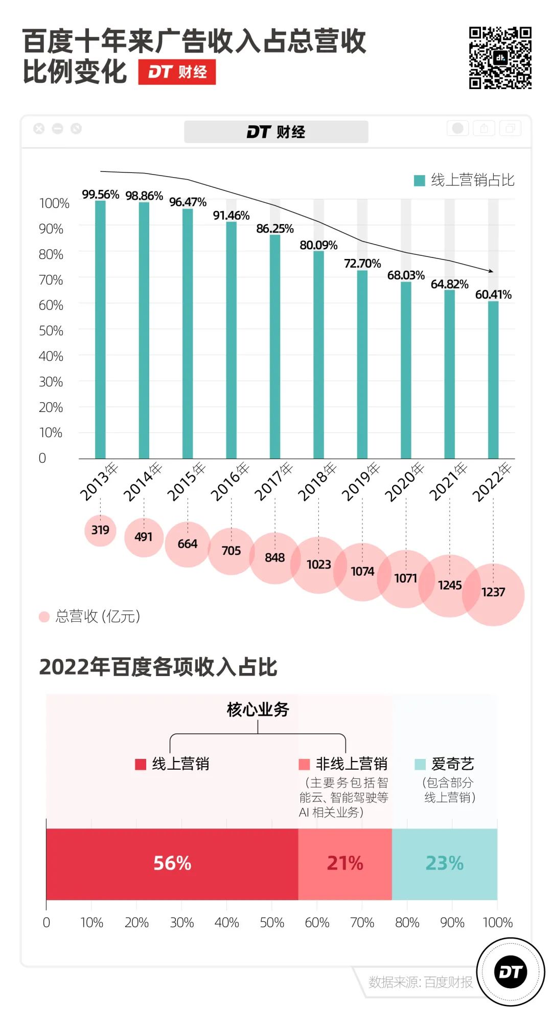 从2013年建立深度学习研究院开始,百度这十年来,一直将资源大幅投入在AI研发,有意识地削弱线上营销在百度营收中所占据的比重。