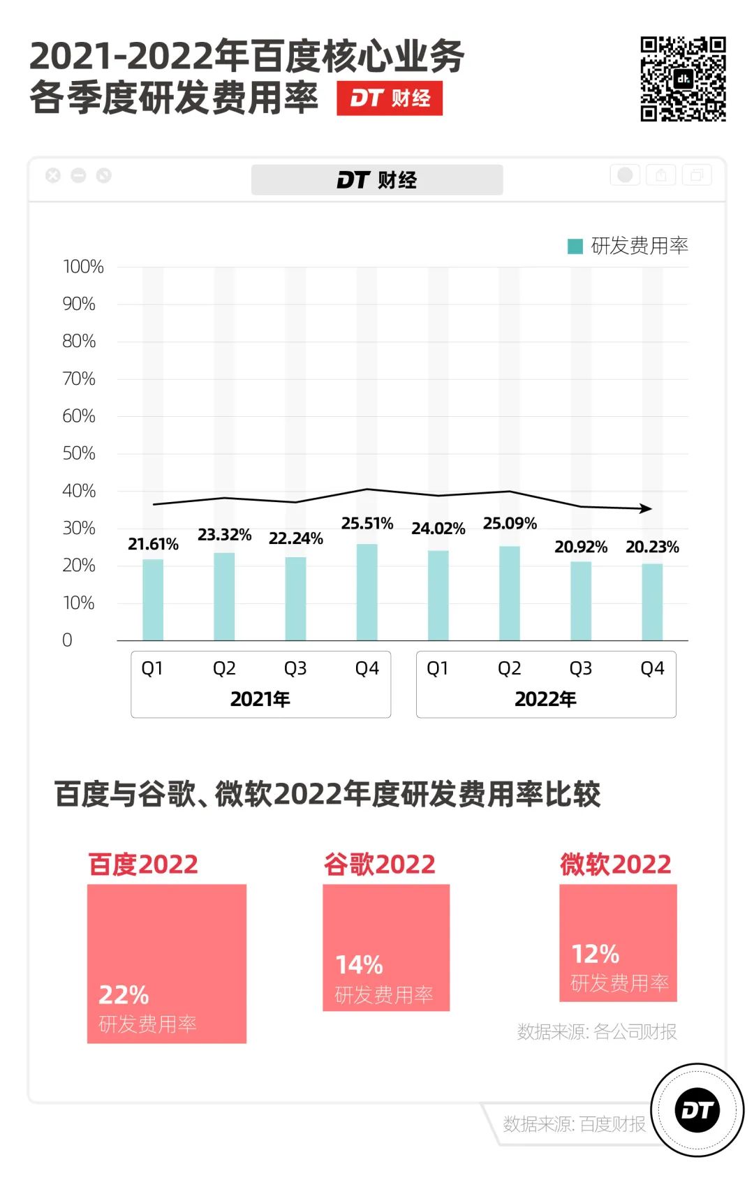 但百度想要真正转型,砸钱就是必须的。2022年,百度核心的研发费用共计214亿元人民币。截至2022年第4季度,研发费用占百度核心收入比例(研发费用率)连续 9个季度超 20%。作为比较,2022年谷歌的研发费用率是14%,而投资了OpenAI的微软2022年研发费用率是12%。