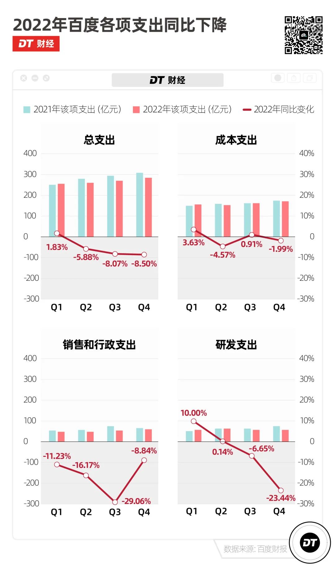 2022年从第2季度到第4季度,百度的总支出已连续3个季度同比负增长,全年支出同比下降了6.5%。具体到各项支出,在成本相对稳定的情况下,其它费用都被百度大幅削减:相对上一年同期,2022年第4季度的研发费用下降了23.4%,2022年第3季度销售和行政支出甚至被压缩了将近30%。