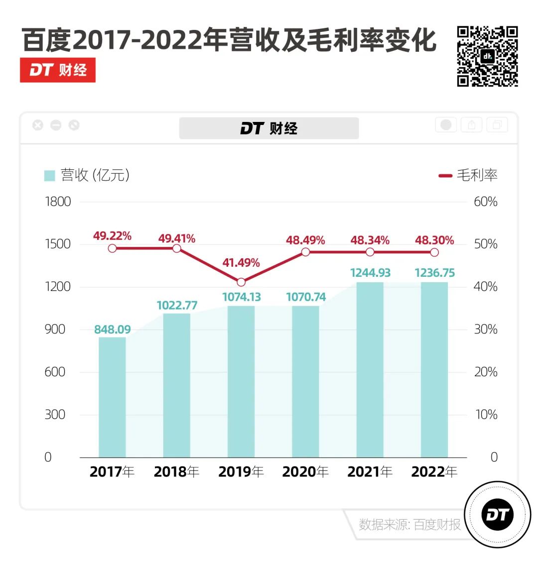 财报显示,从2017年到2022年,百度的总营收规模从848亿元上升到了1237亿元,除了2019年毛利率跌至41.49%,其余五年的毛利率都维持在了48%-50%左右。作为参考,阿里巴巴和腾讯最新季度财报的毛利率分别是39.5%和44.2%。