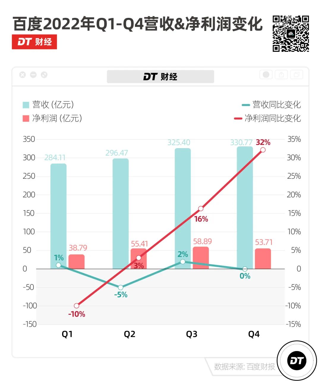 最新发布的财报数据显示,百度2022年第4季度净利润达到53.7亿元,同比增长了32%。这在相对冷清的大环境中已经算是比较亮眼的成绩。